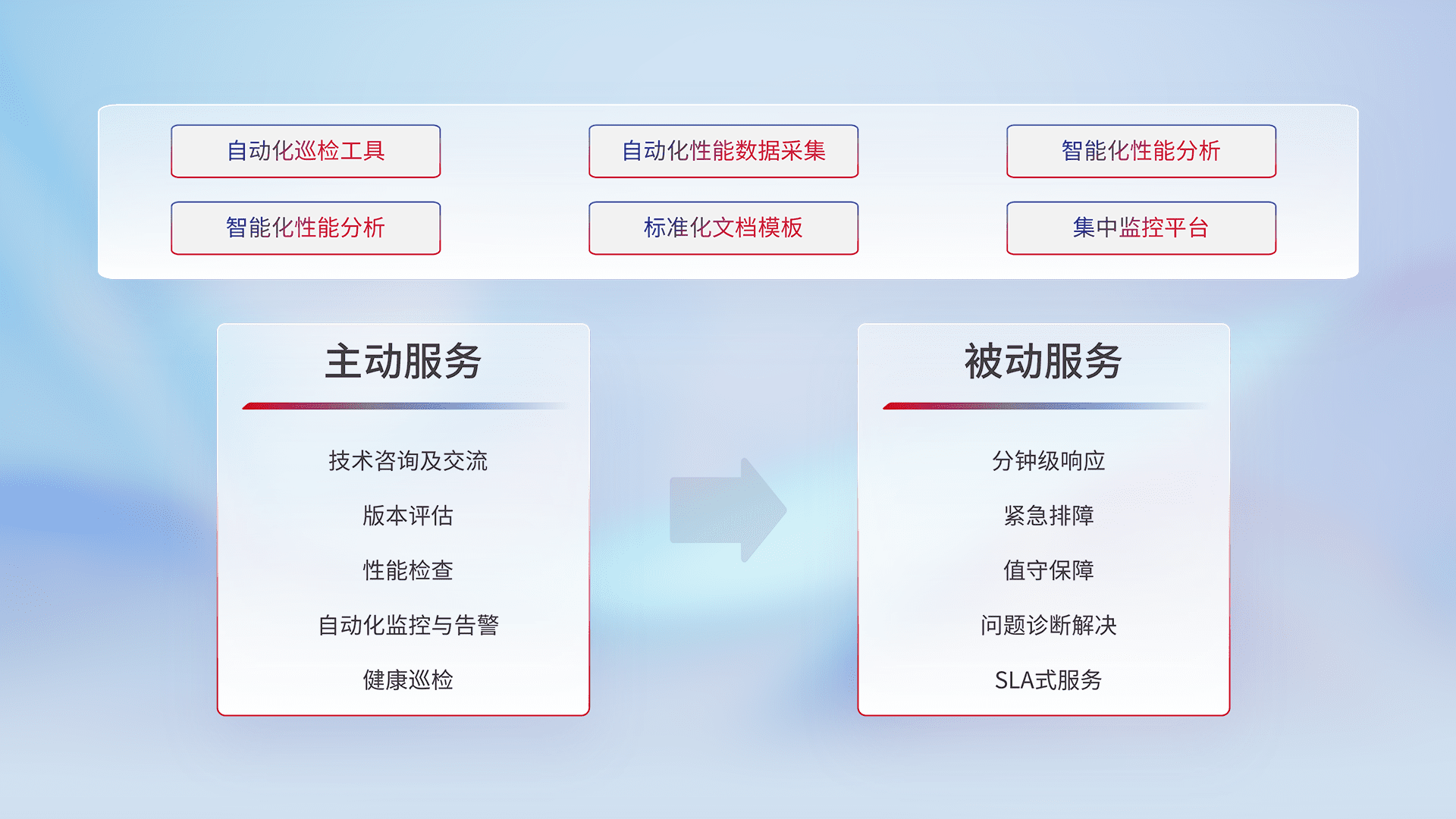 智能化工具和标准化文档,,,,保障服务质量,,提供主动服务(包含技术咨询、、、、版本评估、、、、性能检查、、、、自动化监控与告警、、健康巡检)和被动服务包含(分钟级响应、、、、紧急排障、、值守保障、、问题诊断解决、、、SLA服务)。。。